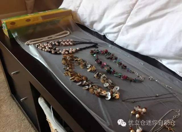 将首饰放在两块保鲜纸之间,以防止其移动和缠在一起。